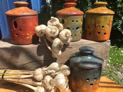 Vous aimez l' ail mais vous n'arrivez pas à le conserver? D' abord, ne jamais le mettre au frigidaire. Ensuite, le garder à l' abri de l' humidité pour l' empêcher de germer ou de pourrir. Mes pots à ail sont conçus pour garder l' ail au sec car n'étant pas émaillés à l' intérieur ils absorbent l' humidité et conservent l' ail longtemps.